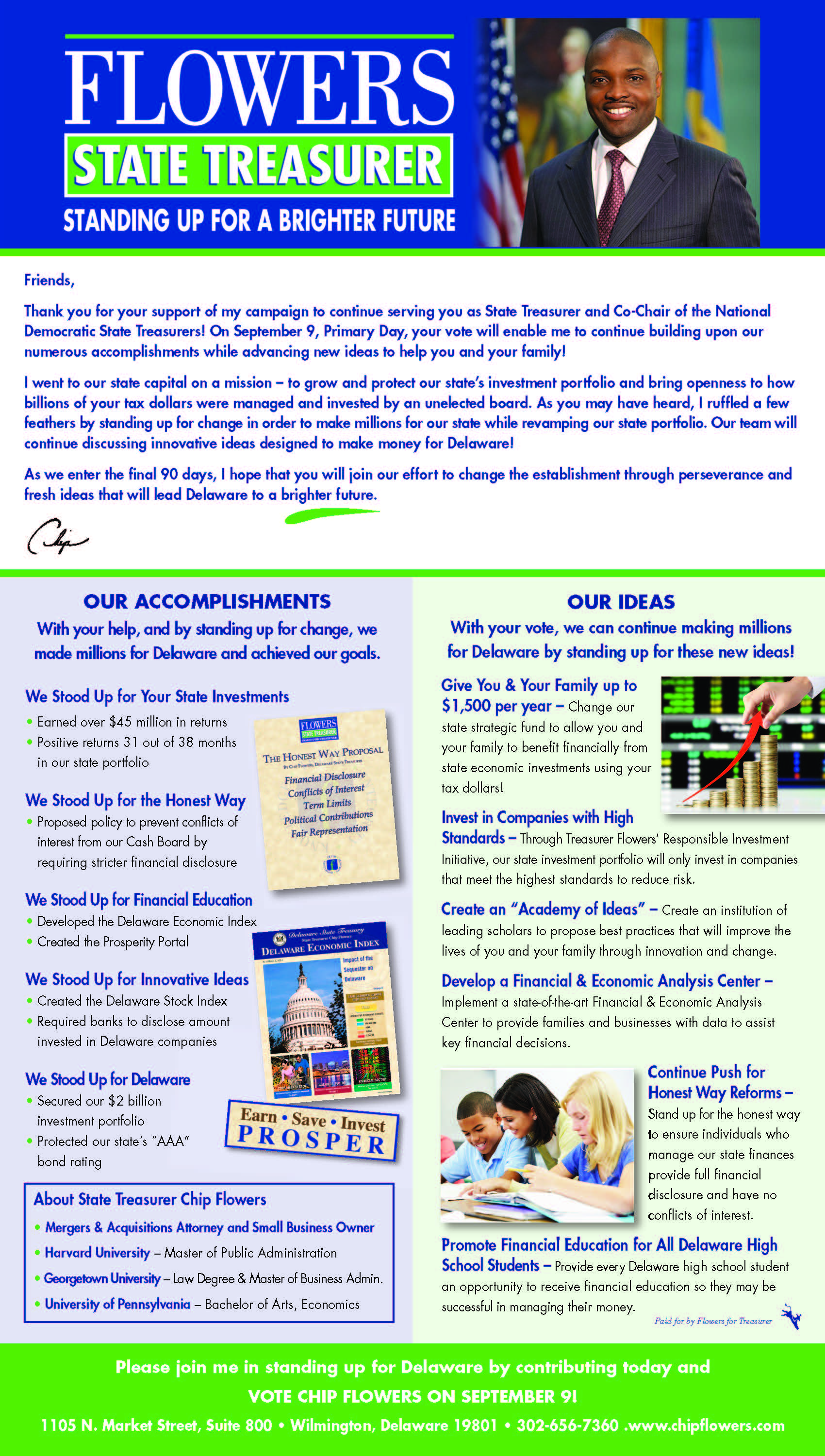 Mr. Flowers and the board, which includes three members of Gov. Jack Markell’s administration as well as five other gubernatorial appointees appointed by the governor and confirmed by the Senate, have been at odds since his election in 2010. Most recently, the governor supported legislation which clarifies policy and investment practices of the board and redefines the treasurer’s role on the board.
